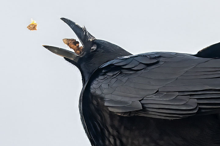 A crow appears to be choking on some food.
