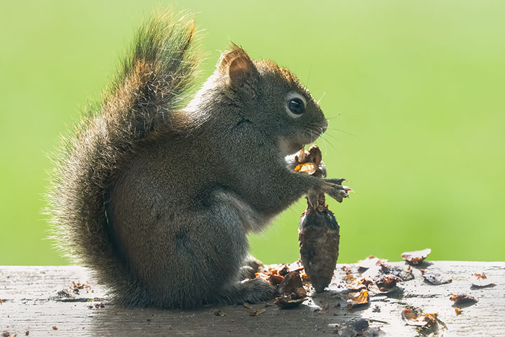 A red squirrel is halfway through eating the seeds of a cone.