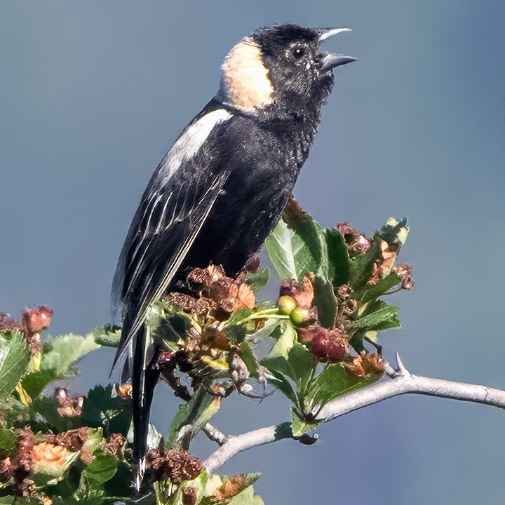 The male Bobolink was singing as it perched on a bush in the grasslands of Kokanee Park.