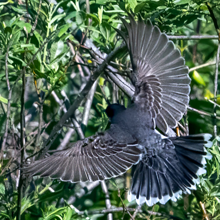 It turned out that there were two birds close to one another and I sometimes followed the wrong one. The other was an Eastern Kingbird. Here, it is flying off.