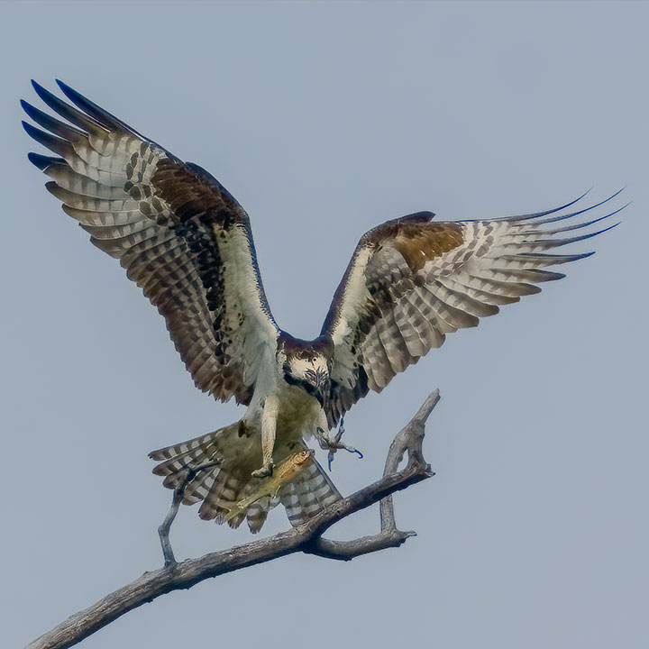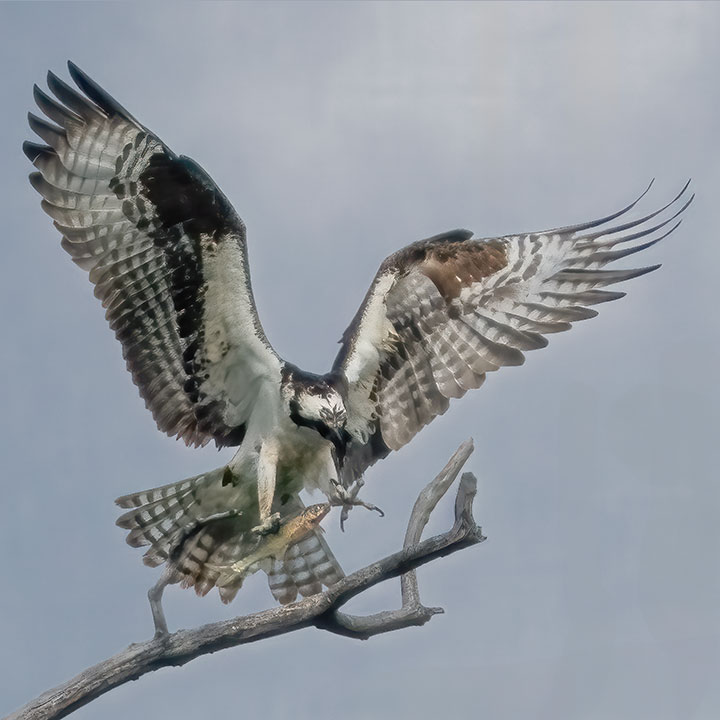 Cynthia’s picture of an osprey landing on a branch with its fish.