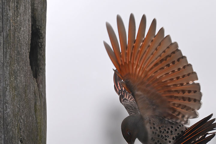 Two Northern Flickers were courting by bobbing at one another on the top of a tall piling. They then flew off – or so I thought. I kept shooting, hoping to catch their initial flight.