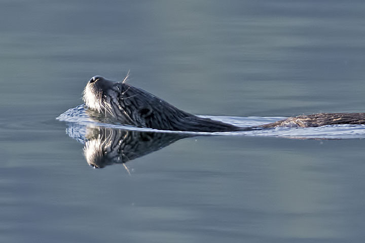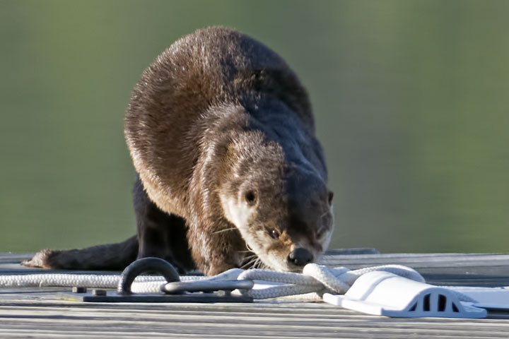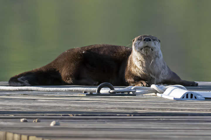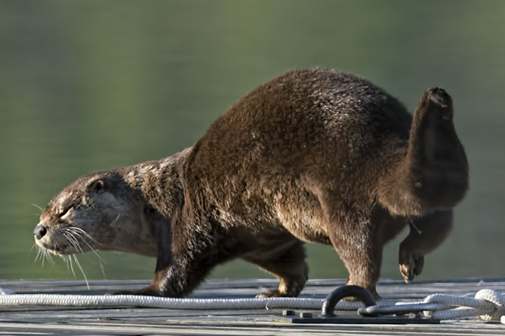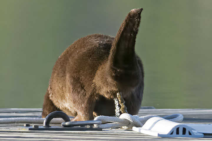 Satisfied that others would now recognize this territory as occupied, it walked to the edge of the dock. Normally, such a side view shows a flat, not bulging, abdomen. This otter is pregnant; it is the season.