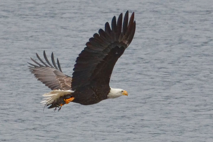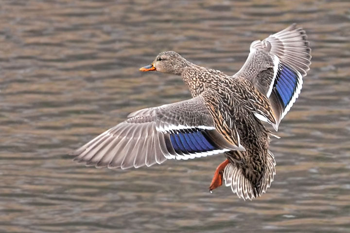But, a couple of other birds did fly by: a female Mallard and a adult Bald Eagle. The Mallard offered a lovely display of its speculum. The eagle was packing lunch: a pigeon. Oh yes, note that the Mallard is deploying its alulae.