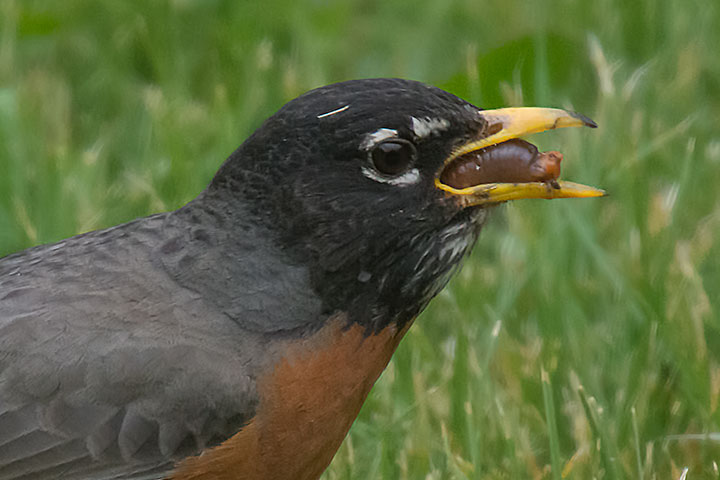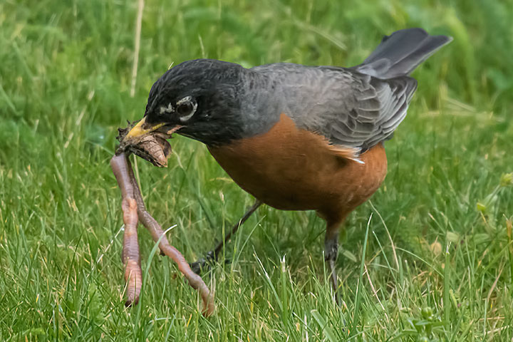 It then spotted a worm and tried repeatedly before it succeeded in picking both up at once to carry back to its chicks. The nest was not far away, so why didn’t it just make two trips? It probably feared that the other robins on the lawn would grab the worm while it was away.