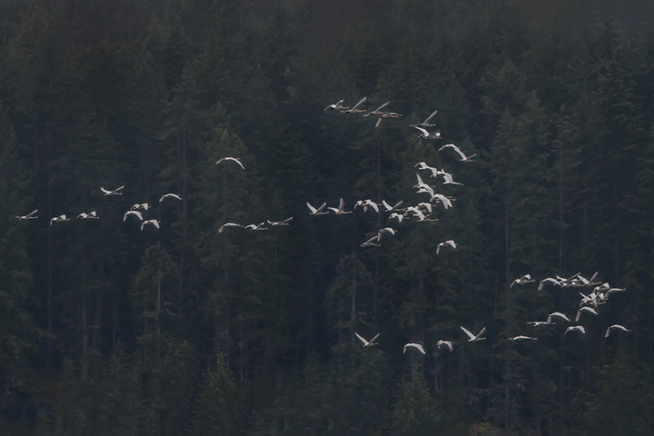 Nancy, this happened last Saturday morning. These swans arrived at the Kokanee Narrows at about 9:15 a.m. probably from the east. So they would have likely passed Sunshine Bay at about nine. At about 11:20 a passing boat spooked them and they all flew west, which is when I saw them. The same day around a hundred swans were seen at the north end of the Lake. Further, on Sunday about 200 were seen in the Nicola Valley. Clearly, the northward migration is on.