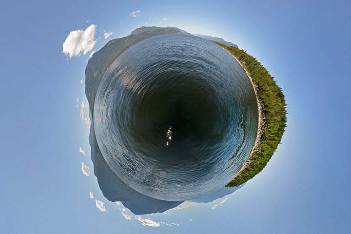 August’s panorama is presented in the style known as the little planet. The location is Kootenay Lake just off the Pilot Bay Peninsula. The image is oriented as the globe of the Earth: north at top, west to left. The view shows the greenery of the peninsula on the right, South Arm at the bottom, West Arm on the left, and North Arm at the top.