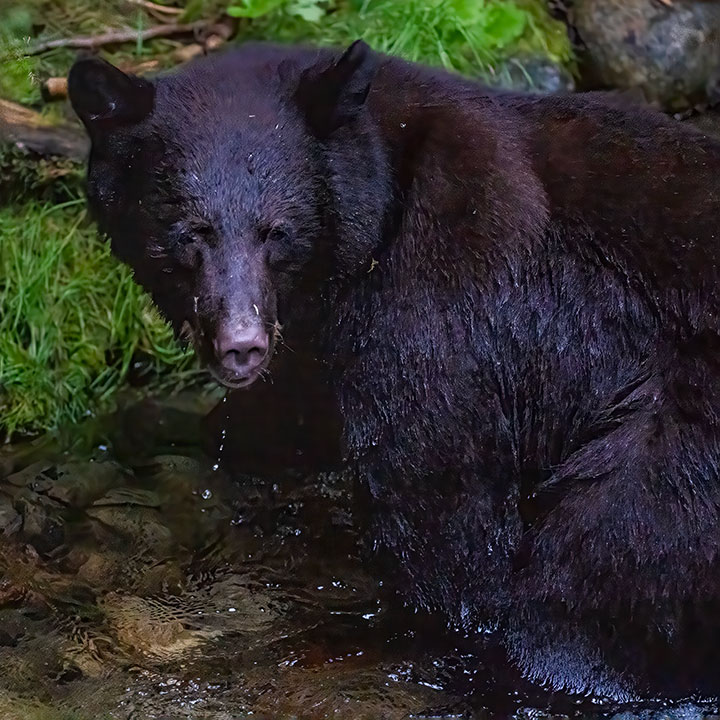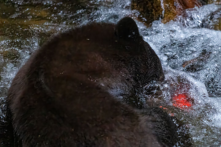 The black bear pauses while trying to catch fish in the creek. During dips in the water, it hasn’t wetted a small portion of its back, which looks lighter brown.