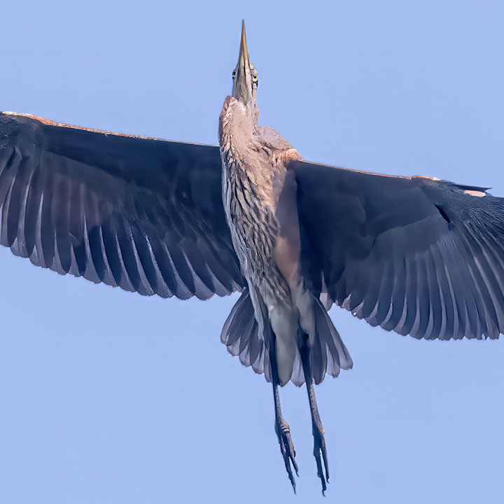 A characteristic of young birds is that they are frequently curious about humans. This one flew right over me always looking down. When they are older, herons just fly away.