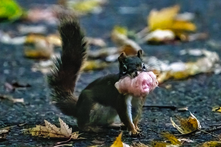 In the early hours of the morning, a squirrel was repeatedly rushing across the driveway carrying something large in its mouth. I had previously seen a squirrel carrying food or grass, but this was different.