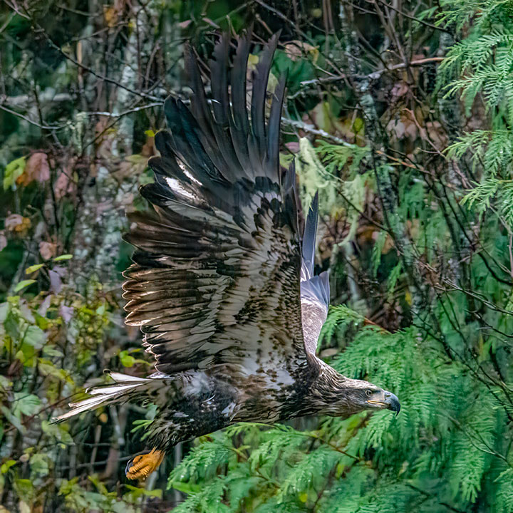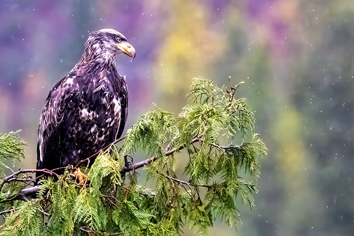 A juvenile eagle looks out from a branch. It is probably 3 years old.