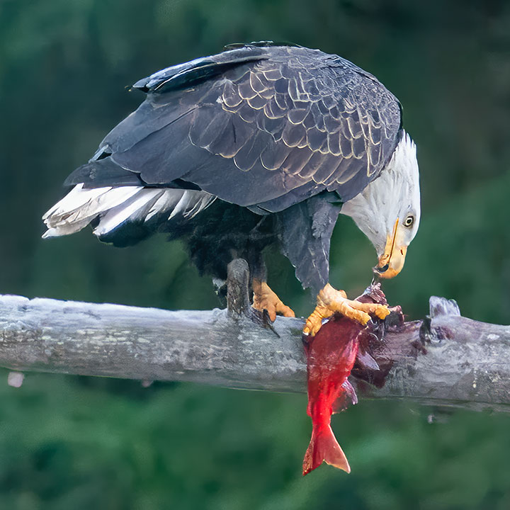 While the eagles spend most of their time just sitting, they occasionally will fly down to the water, catch a fish, bring it to a perch, and eat it. Photo by Cynthia.