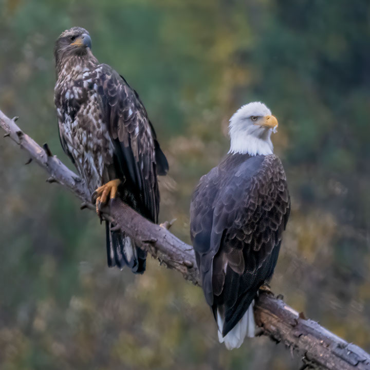 A juvenile (left) and an adult Bald Eagle rest on a branch.