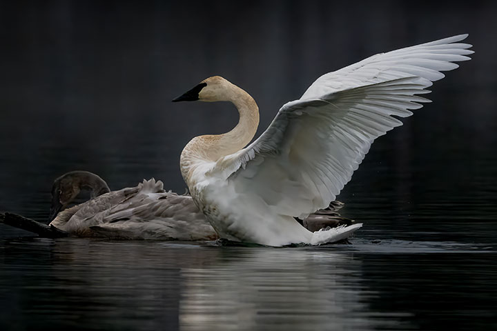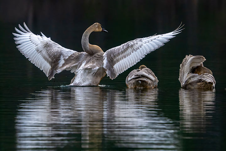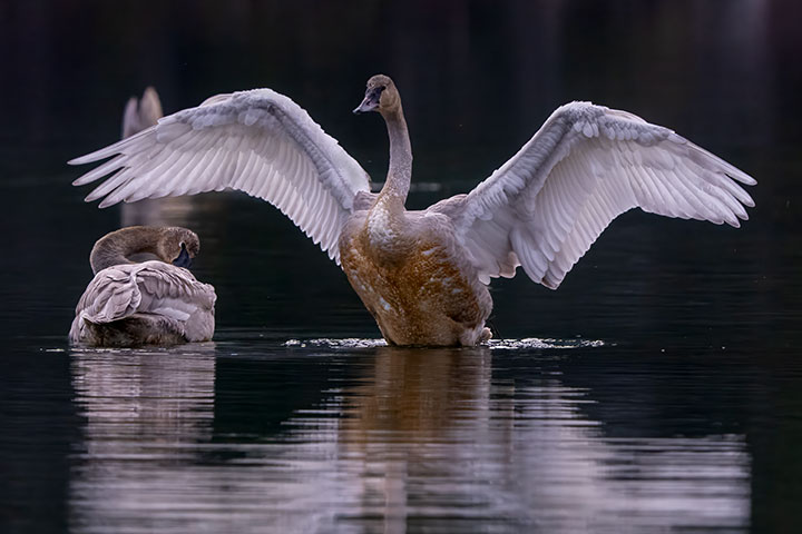 There are two cygnets here. Both are preening. The one is using its bill on the feathers to clean and tidy individual feathers. The final stage of preening is demonstrated by the bird with its wings spread. Here the feathers are all coaxed to line up.