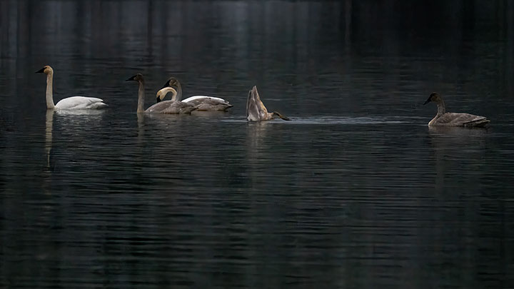 Here is the whole family, with the two whitish adults and the four greyish juveniles or cygnets. Come summer, the cygnets will have turned white. Here, one cygnet is tipped up as it feeds in the shallow water.