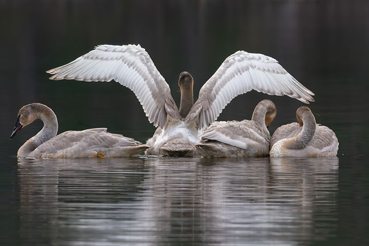 Here are three of the cygnets, but one has its wings spread revealing the distribution of grey colour on the wings and body.