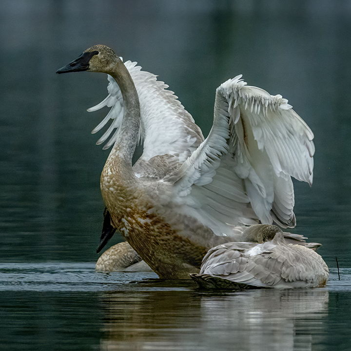Another cygnet with wings spread reveals a rusty colour on the underside. This colour probably results from the feeding area in which it was born. There are two other cygnets in this picture. Photo by Cynthia.