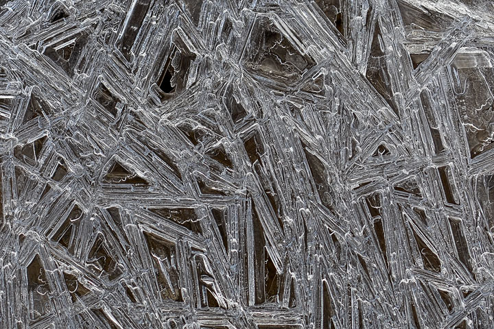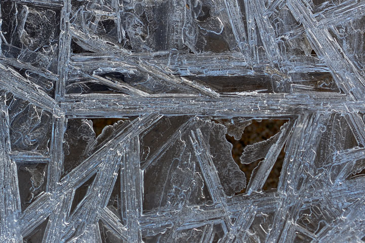 Alas, an understanding of the places ice forms does not equip one to understand the beautiful patterns it assumes. About all that can be said is that in these conditions, the border ice always seems to take the form of needle crystals oriented randomly in the horizontal.