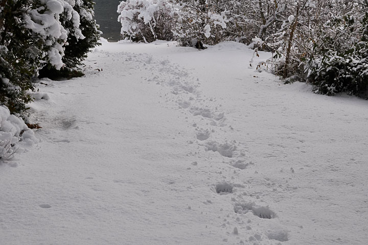At the north end of the Lake, a friend put his bird feeder out again yesterday, thinking that the bears have now retreated for the winter. Yet, among the visitors to my snow–covered yard overnight was a bear (tracks below). So, I checked some earlier images and I have seen bear tracks in the snow in my yard into the second week in December. Nevertheless, last night’s bear did not discover my bird feeder.