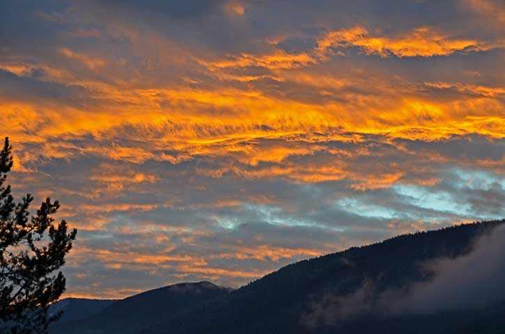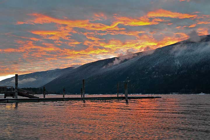 Winter brings stratus to Kootenay Lake; stratus brings skies of slate. If the cloud breaks up at dawn or dusk, the low Sun may splash the slate with fire. Such was case Christmas morn—supplemented by reflections off the lake.