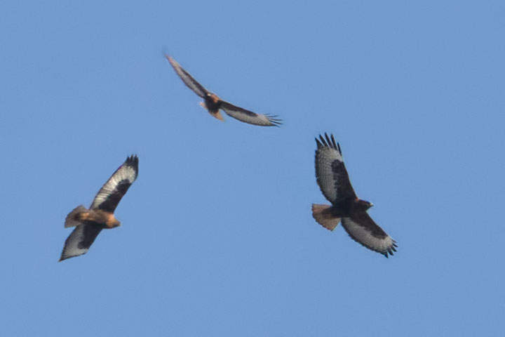 This is a composite showing three views of the same soaring bird. When seen from a great distance, the white on the underside of the wing and the golden colour around the neck prompted me to think this was a Golden Eagle. Alas no, the pictures almost certainly show an intermediate phase Red-tailed Hawk.