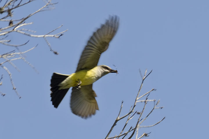 This Western Kingbird is carrying a twig—probably to serve as nest material.