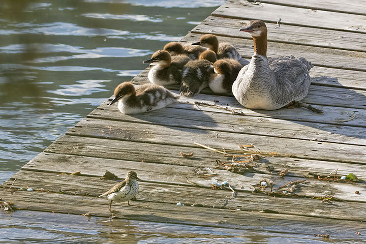 Having recently shown merganser competition, it was now fun to watch as a family of Common Mergansers ignored a passing Spotted Sandpiper. Neither species saw the other as a threat.