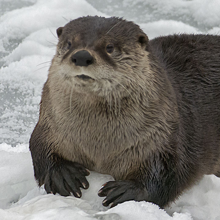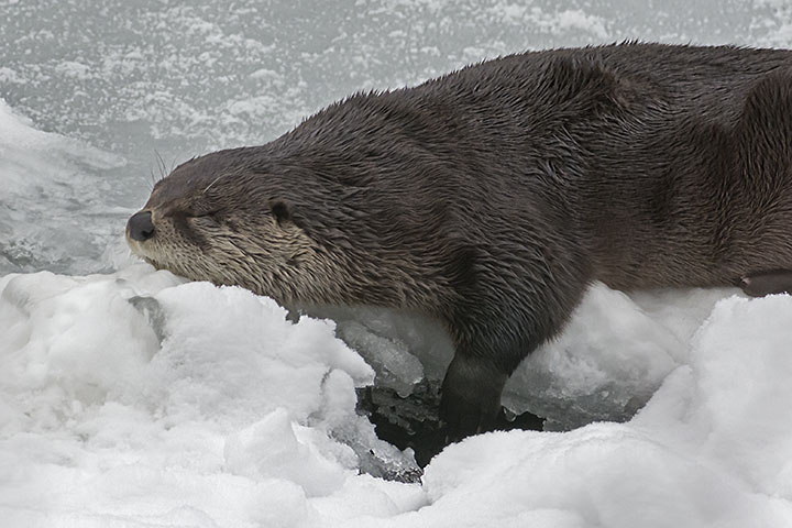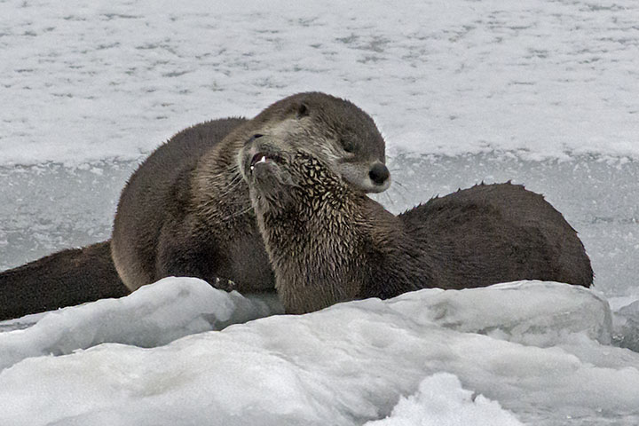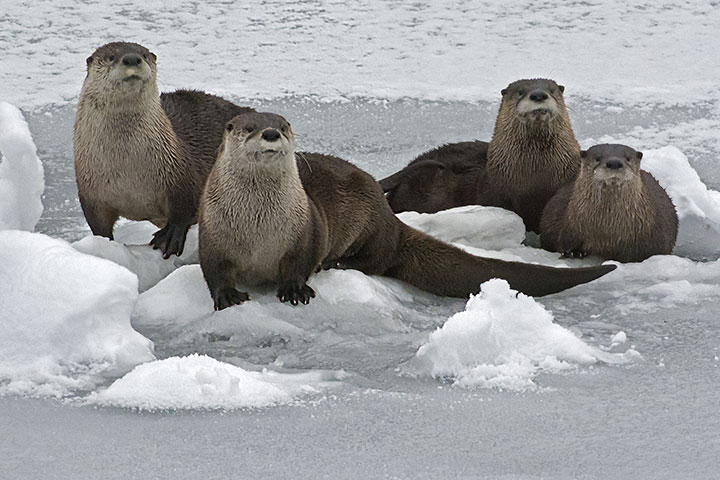 Tracks across the ice, local piles of snow, and openings in the ice, all hinted at a haven for otters. Soon there was confirmation as heads poked through the ice; some otters lounged on top, others hunted in the open water.